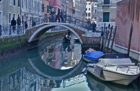 Loaded; low bridge; Venice, Italy. December 2014.