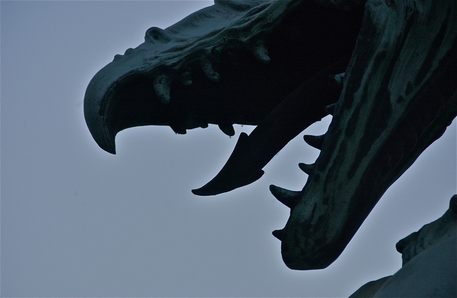Tongue, teeth; dragon at the bridge; historic district; Ljubljana, Slovenia. January 2015.