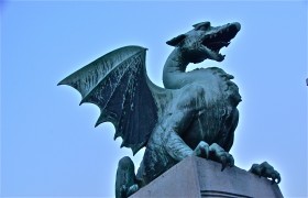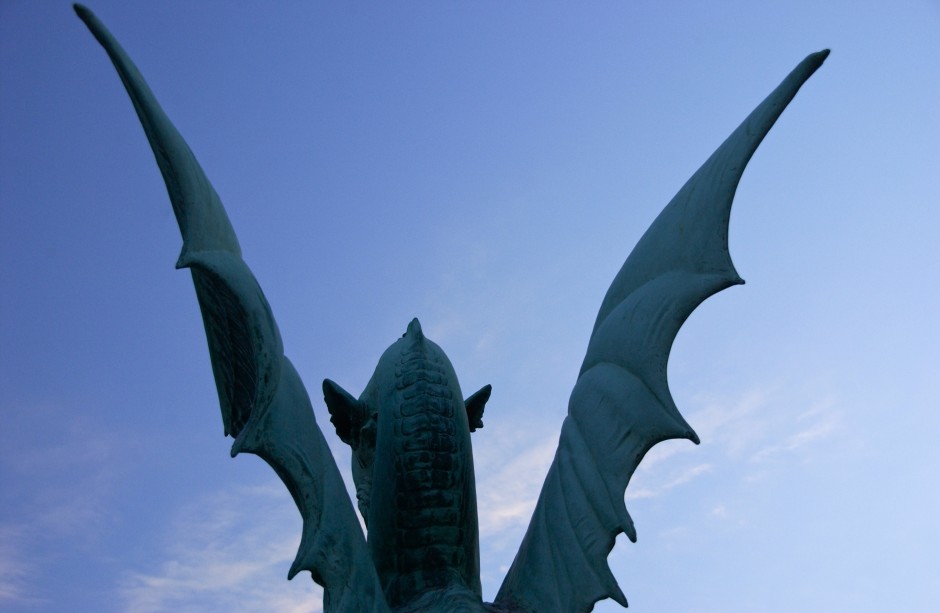 Wings; dragon at the bridge; historic district; Ljubljana, Slovenia. January 2015.