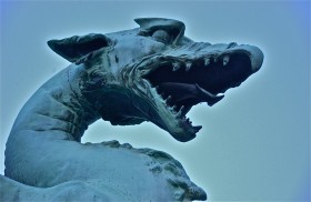 Ferocious; dragon at the bridge; historic district; Ljubljana, Slovenia. January 2015.