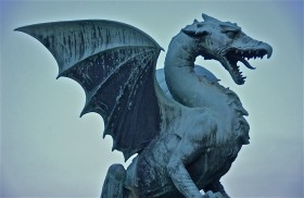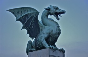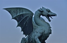 Fearsome; dragon at the bridge; historic district; Ljubljana, Slovenia. January 2015.