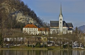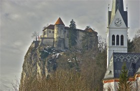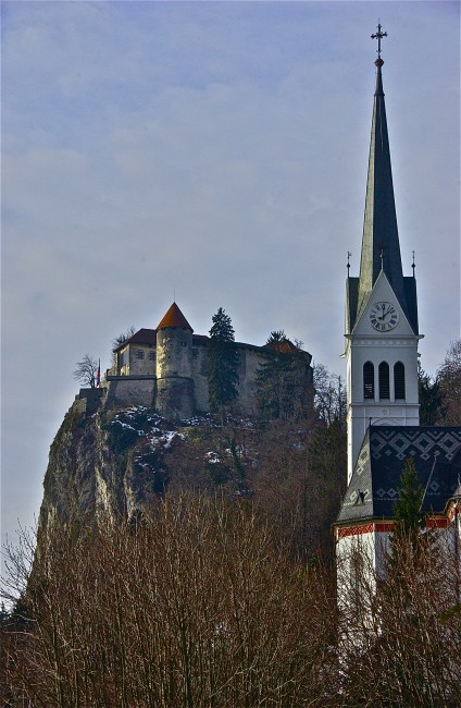 Church of St. Martin, the castle; Lake Bled, Slovenia. January 2015.