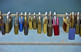 Couples; love locks; on the bridge; Ljubljana, Slovenia. January 2015