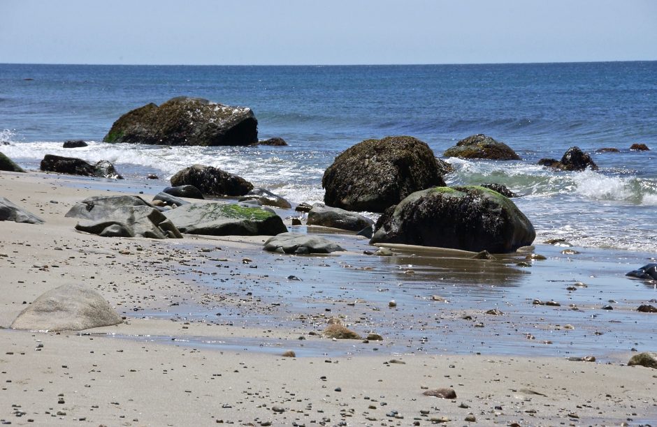 Dry … for now; rocks at the margin of sand, sea; Aquinnah, formerly Gay Head, Martha’s Vineyard, Massachusetts, USA. June 2015.