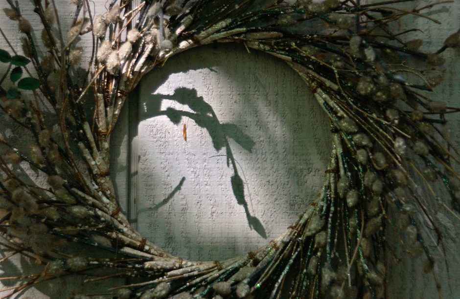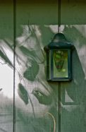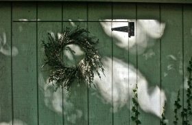 Garden shed wreath, light, shadows; Wyncote, Pennsylvania, USA